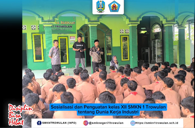 Trowulan โ SMKN 1 Trowulan melaksanakan kegiatan Sosialisasi Dunia Kerja yang ditujukan untuk seluruh siswa kelas XII dari tujuh jurusan. Kegiatan ini merupakan bagian dari upaya sekolah dalam mempersiapkan peserta didik memasuki dunia industri, dunia usaha, maupun peluang kerja lainnya setelah lulus.